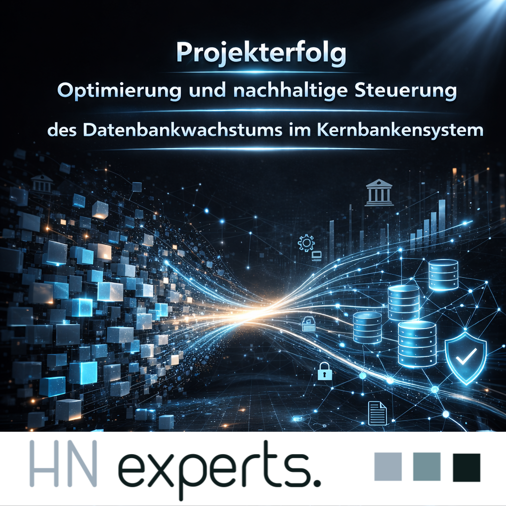 Über mehrere Projektphasen hinweg unterstützte HN Experts die Bank mit umfassender Projektmanagement- und PMO-Expertise. Ziel war es, ein erhebliches Datenbankwachstum der Kernbanksystems nachhaltig zu reduzieren, die Systemstabilität zu sichern und regulatorische Anforderungen und Datenschutzrichtlinien zu erfüllen.